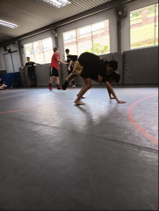 I sparred with someone who does jiu-jitsu like me, and it was a good match. He is a full gray belt in jiu-jitsu and has been training for about two years. After that, we played some games like wheelbarrows and practiced more takedowns.